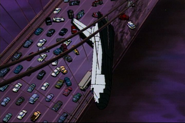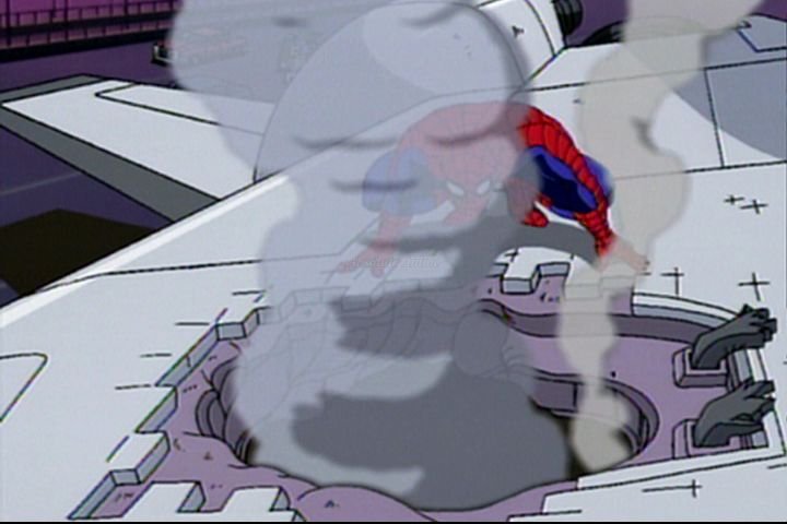 Just to make clear, this is the 1994 animated Spider-Man, not that 1980's Spider-Man and definitely not the recent Spider-Man movies. Okay, we start off with some astronauts up in space, exploring a newly discovered meteor. One of them finds an interesting type of rock, but when he picks it up some black ooze starts pouring out of the crack from which it came. He rushes back to the space shuttle as quick as he can, but then once the shuttle starts to reinter the atmosphere, more black ooze surfaces from the rock samples, and starts to envelope the astronauts. The crew has no choice but to make an emergency crash landing on the Washington Bridge. Unfortunately, someone is waiting for them, and it's not the rescue party.
