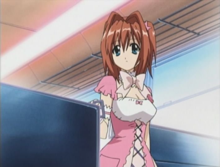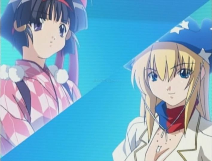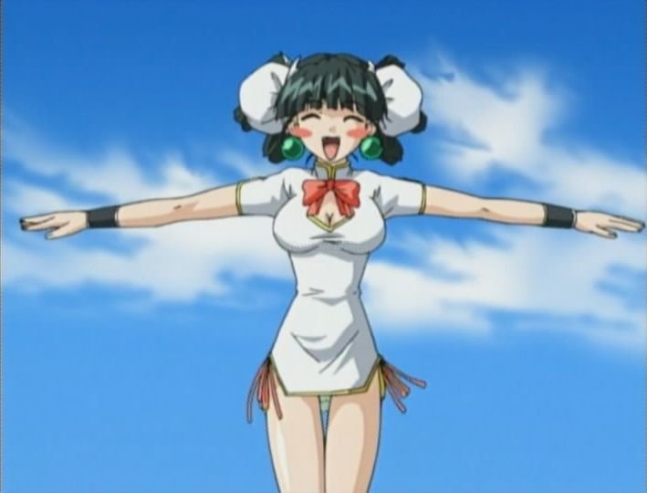 The next scene is when we are introduced to Yu Asuka. She's on a train that's leaving for the tournament she spies a girl running beside the train trying to get her attention. This would be Ayumi Akamoto, who is also heading for the tournament. They quickly become friends, and once their off the train they also quickly meet a third contestant in the tournament, a cute Chinese girl named Yung Ching Jyu (but call her Tama-chan!), who literally drops in from above just like you'd expect from a Chinese acrobat in an anime series.